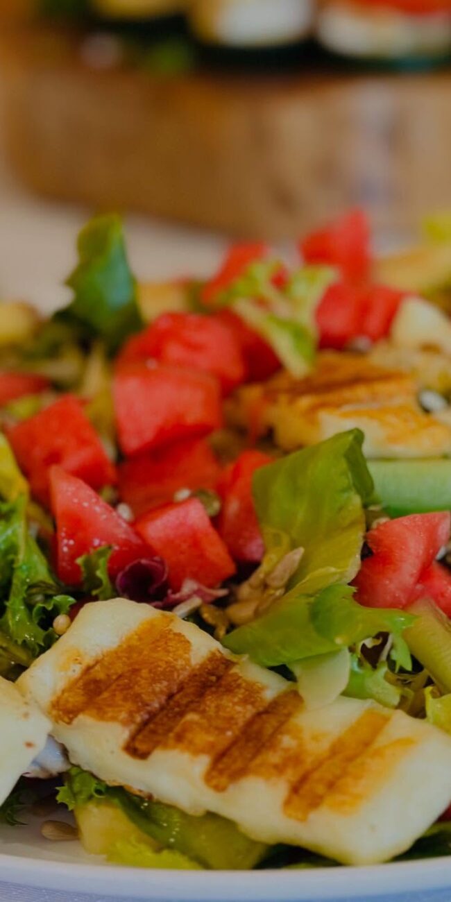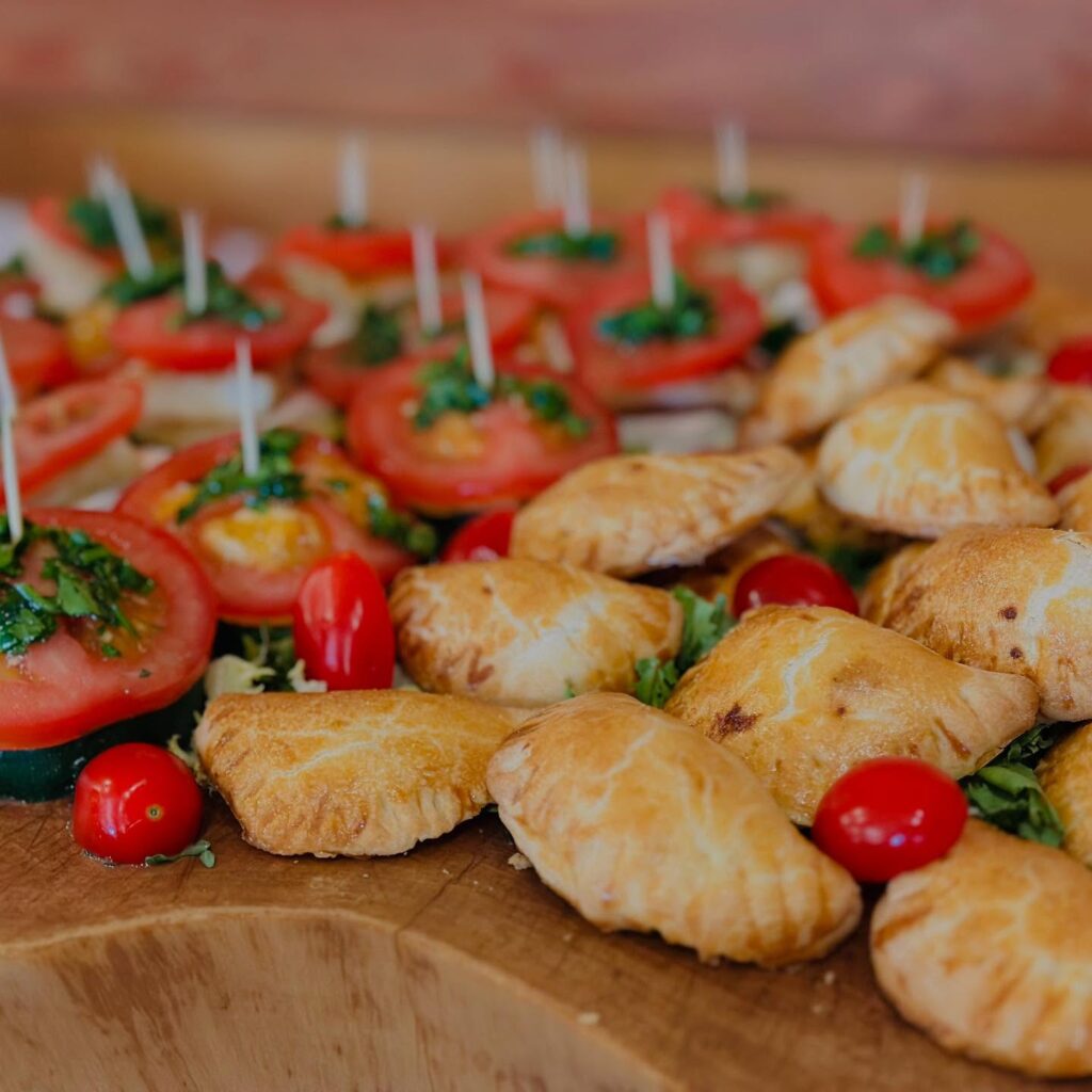 - Rożki z ciasta francuskiego nadziewane: ser halloumi z dipem chrzanowo-miodowym / kurczak curry / grillowane warzywa……75zł/10szt.